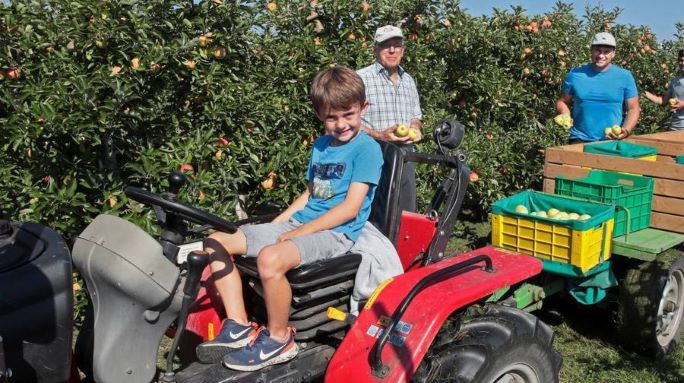 Zwischen August und Oktober, der Erntezeit, packen neben Sohn Rainer zwei feste Helfer aus Ungarn und "einige rüstige Rentner" auf der 5,5 Hektar großen Hoffmann'schen Plantage am Insultheimer Hof mit an. Walter Hoffmann sorgt derweil unter anderem für frisch gepressten Apfelsaft, den die Familie in einer Kelterei herstellt.