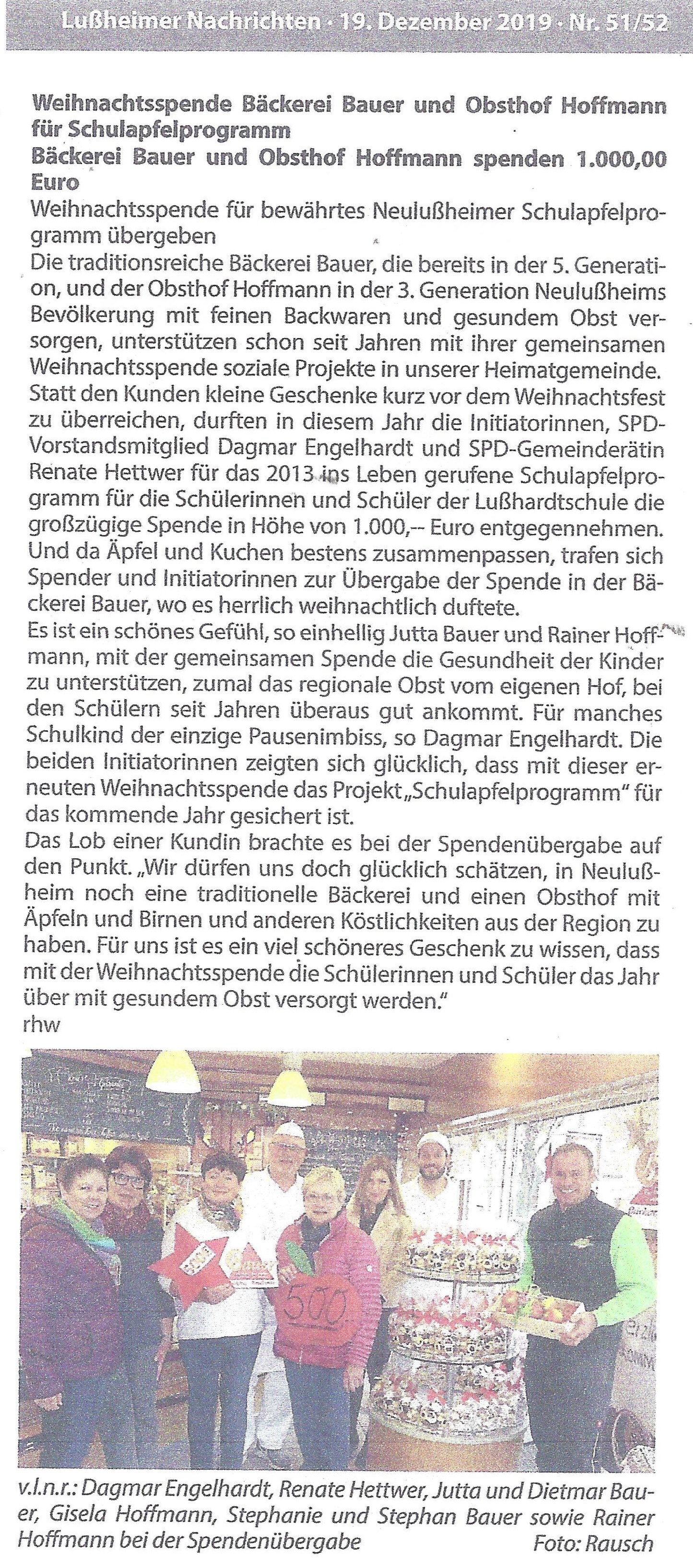 Das Lob eines Bäckereikunden brachte es während der Spendenübergabe auf den Punkt: „Wir dürfen uns doch glücklich schätzen, in Neulußheim noch eine traditionelle Bäckerei, die Wert auf Bioprodukte legt, und einen Obsthof mit Äpfeln und Birnen, die in unserer Region wachsen, vor Ort zu haben. Für uns Kunden ist es ein viel schöneres Geschenk zu wissen, dass mit der Weihnachtsspende der Förderverein Schüler in verschiedenen Projekten unterstützt.“