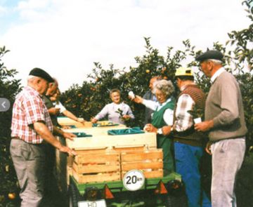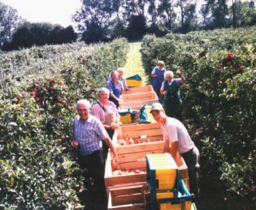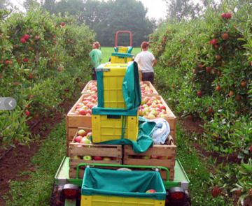 Je nach Sorte wird 3-5 mal durchgepflückt, wobei bei jeder Pflücke nur die schönsten Früchte geerntet werden. Die Ernte erfolgt mit zwei Erntezügen in je 4 Großkisten à 300 kg. Unsere Apfelpflücker werden immer wieder dazu angehalten, nur die Früchte zu pflücken, die sich im Zustand der so genannten Pflückreife befinden.Denn zu reife Früchte haben keine Lagerfähigkeit, zu grüne Früchte haben zu wenig Geschmack.