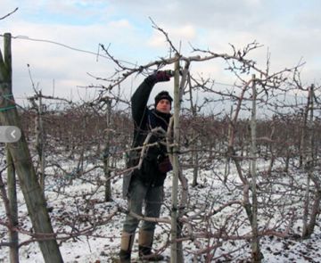 Hofproduktion1. Baumschnitt von Dezember bis Anfang April. Sehr wichtig für ein ausgeglichenes Wachstum der Bäume und für eine gute Belichtung der Früchte im Sommer. Deshalb Chefsache! 2. Rodung von Altanlagen und Erstellung von Junganlagen. Die Erstellung eines Hektar Junganlage kostet mit Bäumen, Pfählen und Beregnung etwa € 20.000. Durch ständige Erneuerung der Obstanlagen sind wir immer auf dem neusten Stand. Junge Anlagen bringen in der Regel die bessere Qualität.